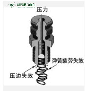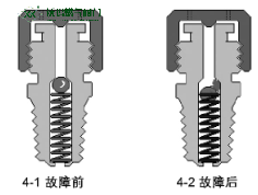 如下頁圖3所示,壓邊失效和彈簧疲勞失效是導(dǎo)致注脂接頭失效的重要原因。如下頁圖4-1所示是故障前注脂嘴結(jié)構(gòu);如圖4-2所示,則是注脂接頭內(nèi)的止回球由于被污物(沙粒、金屬碎屑、固化脂等)卡住或彈簧失效而無法回復(fù)到原位,從而失去止回功能導(dǎo)致泄漏發(fā)生。此外還有止回球鋼珠破損等原因造成注脂嘴產(chǎn)生泄漏。