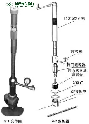 通過采用TDW公司的T101b鉆孔機及其附件,對失效注脂嘴進(jìn)行在線帶壓拆卸和更換。T101b鉆孔機可實現(xiàn)密閉狀態(tài)下被夾持工件的螺旋式上升和下降(便于螺栓的擰緊和松開),亦可以實現(xiàn)內(nèi)部夾持工件的垂直上升和下降 (便于注脂嘴螺栓擰緊到位后夾持器與工件脫開),T-101b帶壓更換工具(如圖9-1,9-2)。